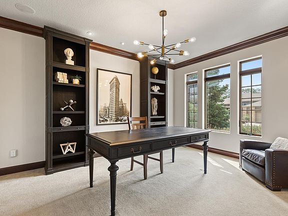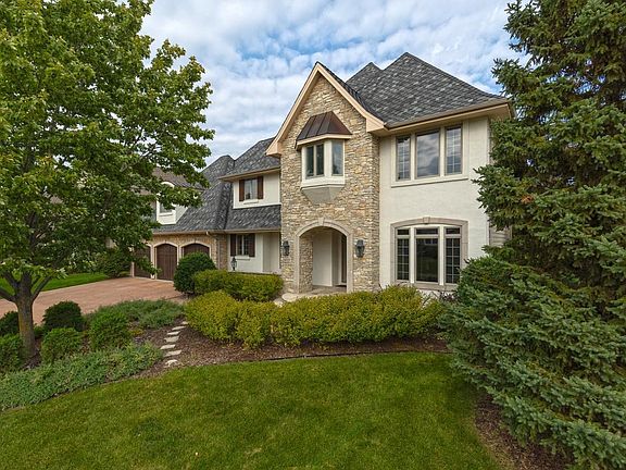 Crafted by Swanson Homes, this custom 5-bed/5-bath 2-story home blends architectural elegance with modern day functionality. Open concept with gourmet kitchen, recently remodeled living room, formal and informal dining spaces and a beautiful private office on the main level. Four bedrooms up, one of which could easily serve as a rec room or second office. Fabulous primary suite with spa-inspired bathroom that feels like a true sanctuary with a high-end sauna and instant hot water. The walk-out lower level is perfect for entertaining or relaxing. Spacious bar, billiards area, a fully equipped private gym, large/retractable projector screen and integrated smart home features for your recreational enjoyment. You will love the cozy three-season porch with fireplace that leads seamlessly to backyard deck, which overlooks the remarkably spacious and private backyard with custom putting green (with plenty of room to add a pool)! Expansive windows frame stunning views and fill this home with natural light. Freshly painted interior and exterior and many recently updated light fixtures throughout. Brand new Polymer-Modified Asphalt roof in 2020. Fabulous 3-car garage with great storage and epoxy flooring. This was a former model home and has incredible custom details that you'll love to see in person. Located in a highly desirable neighborhood, this home delivers on luxury, leisure, and location.