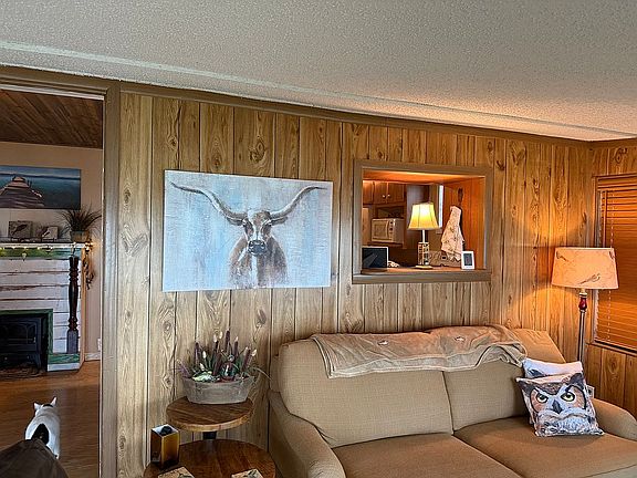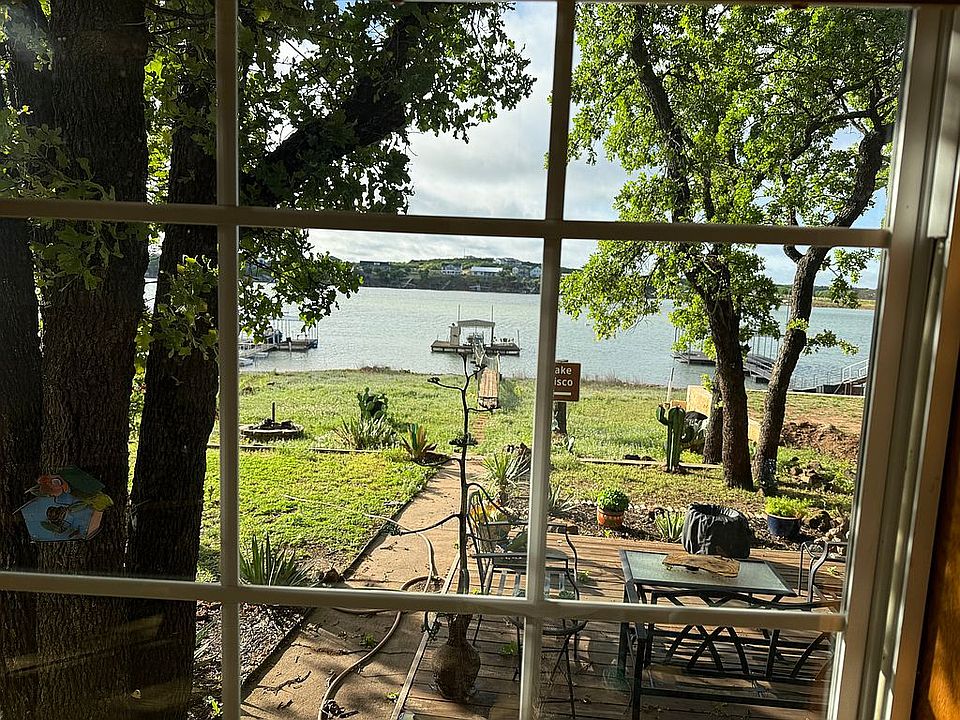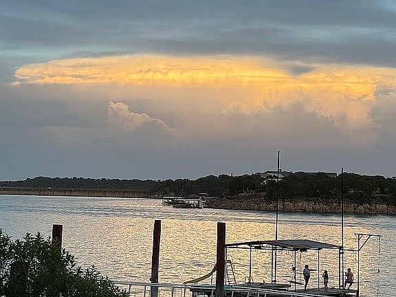 Floor to ceiling windows facing lake with gorgeous view of lake and dam
