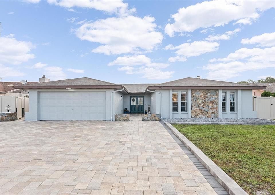 Welcome to your new home! This charming 3-bedroom, 2-bathroom house is waiting for you and your family to create memories. With a spacious 2-car garage, 3-car wide driveway, and screened-in swimming pool, there’s plenty of room for all your vehicles, guests, and outdoor activities. This home shows pride of ownership as it has been meticulously maintained. The remodeled master bathroom boasts modern fixtures and finishes, and the freshly painted exterior and interior give the home a fresh, clean look. The wood-burning fireplace in the living room, complete with a solid wood mantle, is perfect for cozy evenings with family and friends. You ‘ll have peace of mind with the ADT Security System that is already installed and ready for you to activate if you choose to do so. Take a dip in the screened-in swimming pool or soak in the hot tub, surrounded by a newer vinyl fence, and relax in the privacy of your own backyard. The property features approximately 3000 square feet of pavers on the driveway, garage floor, the pool deck, and around the sides of the home. There’s plenty of room for outdoor activities or entertaining. The home is located on a quiet cal-de-sac and is just 5 minutes away from Werner-Boyce Salt Springs State Park where you can go fishing, kayaking and hiking. There are no HOA fees! This one is a must see! The property had a repaired sinkhole in 2012, has a full engineering report and is fully insurable. Listing agent is related to seller. Seller painted trim on 3/11/23 after the photos were taken. Delayed showing - first available showing is Friday 3/17 6pm-8pm.