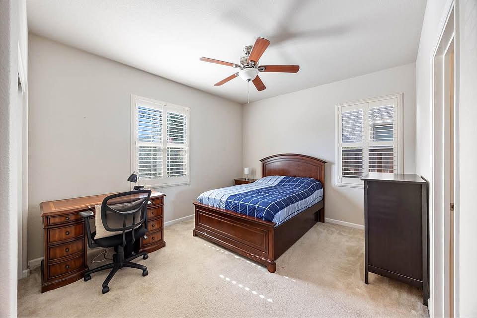Private downstairs left bedroom of a spacious 4-bedroom, 3.5-bath, 2,887 sq. ft. home. Featuring an ensuite bathroom (shower), private balcony, queen bed, workspace, and access to the home treadmill.