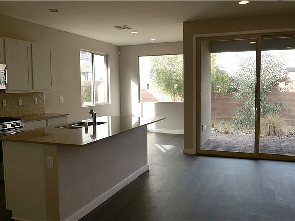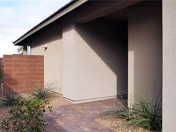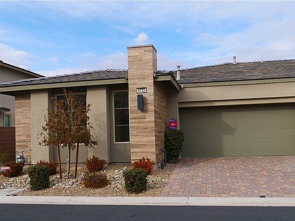 Never lived in - Former Model Home! This new single story is "duet" style and attached to one other home. Features include a spacious open floor plan with waterproof vinyl plank flooring in living areas. The kitchen boasts quartz counters, tile backsplash, large pantry, stainless steel appliances and sink in large island with breakfast counter. The primary bedroom is separate from other bedrooms and has a huge walk in closet and en suite bathroom with double sinks and separate soaking tub and large shower. The 3rd bedroom is very generous in size, with bright front facing windows. Smart Home technology allows for lights, outlets, thermostat and garage door to be controlled with your phone! Tankless water heater and soft water loop installed. Front and backyard are beautifully landscaped. Did we mention the spectacular mountain views of Summerlin! Talk about the perfect location! Welcome Home!!!