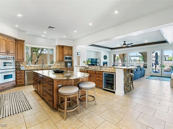 The backyard entertainer's paradise offers a covered patio, built-in BBQ, putting green, and sparkling pool and spa—ideal for Las Vegas living. Large family and living rooms provide ample space, while six spacious bedrooms ensure comfort.