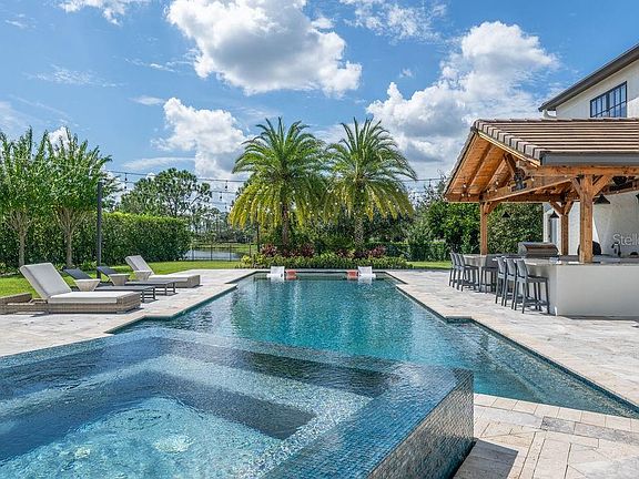 Redefine luxury living. Welcome home to an exceptional lifestyle with an estate that offers impeccable design and unparalleled sophistication in one of Central Florida's most desirable guard-gated communities, Keene's Pointe. This masterfully designed residence, which was fully reimagined and painstakingly renovated over 2 years, blends modern luxury with timeless elegance. No expense was spared and every corner was touched....this is what a real renovation looks like. Perfectly positioned on an expansive .85-acre corner homesite overlooking a tranquil pond, this 7,600 square foot residence welcomes you with a 32 foot tall open entry, taking full advantage of the year-round Florida sunshine. Just off the entry, you will find a private office featuring a coffered ceiling, designer lighting and glass pocket doors. The home offers 5 spacious ensuite bedrooms, including a lavish first floor primary suite, featuring a spa-inspired bath and impressive dressing room with extensive custom storage. In the second-story wing of the home, you will find three secondary ensuite bedrooms, each with beautifully updated baths plus a loft. A private guest suite, set on the second story of it own wing was expertly finished in 2022. Your guests will enjoy a large bedroom, kitchenette, seating area, private bath, large closet and a private entrance, making it the ideal space for extended family or visitors. The third wing of the home features an expansive theater room, with stadium seating, new wet bar and full bath. Entertain effortlessly with the open floor plan, combining living, dining and a seamless transition from inside to your private resort oasis, featuring saltwater pool, spa, outdoor fireplace, covered al fresco dining area with remote controlled screens, brand new open cabana with summer kitchen and bar, and ample green space. Inside, your chef's kitchen awaits, with a waterfall edge island, Thermador appliances, custom cabinetry and butler's pantry, with refrigerated drawers, ice maker and storage. Additional highlights include a 5 car garage, tankless hot water heaters, lighting automation, custom storage areas and dedicated irrigation well. Every detail of this home was carefully curated with timeless elegance, modern functionality and unmatched quality. Coupled with the effortless Florida lifestyle and located just minutes from Orlando's world class attractions and golf, this exceptional home is turn-key ready and truly special. Make your private appointment to see it today.