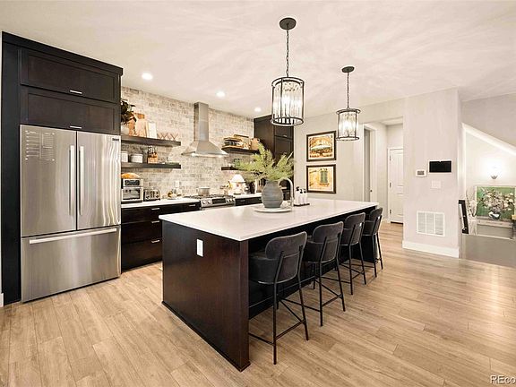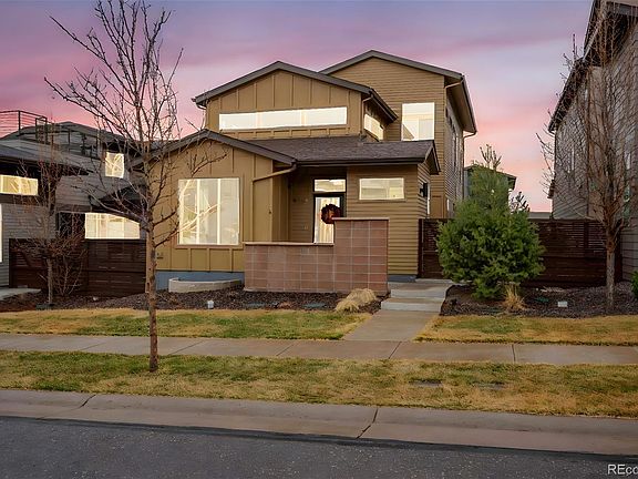 Welcome to Providence Village in the Sterling Ranch neighborhood. Nestled beside the foothills, this 2018 Brookfield Home boasts high end upgrades throughout. Upon walking inside you’re greeted with an abundance of natural lighting & a large, open floor plan, & high ceilings. The living room is backdropped by a stunning upgraded gas fireplace accented by marble tile. LVP flooring expands throughout the main level which complements the living room, dining room & kitchen. The kitchen is backdropped by a stunning full tiled back splash, floating shelves, gas range & hood, espresso colored cabinetry, stainless steel appliances, oversized island & pendants. The oversized dinning room sits off the kitchen. The main level is complete with a bonus office which functions well as additional flex space & an oversized drop zone off the garage connected by the laundry room, complete with custom built ins. The Primary Bedroom is located upstairs and offers an oversized ensuite dual vanity complete with floor to ceiling tiled shower, tiled shower pan & large closet complete with custom built ins with custom frosted closet doors. Two additional bedrooms are also located upstairs, along with the additional dual vanity full bathroom. The finished basement boasts high ceilings, a 4th bedroom, additional full bathroom & an abundance of space perfect for a rec room or playroom which includes custom built ins & storage! Out the dual sliding doors is a private outdoor space perfect for summer BBQs & entertaining, complete with pre ran gas line for a fire pit & low maintenance yard.This home and offers walkability to neighborhood trails, parks, club house, coffee shop, taproom, dentist/doctor/eye care, credit union & much more! Information provided herein is from sources deemed reliable but not guaranteed & is provided without the intention that any buyer rely upon it. Listing Broker takes no responsibility for its accuracy and all information must be independently verified by buyers.