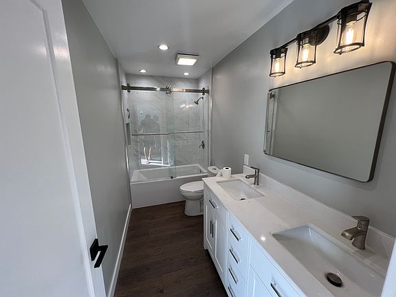 Bathroom is a sing sink 60" vanity. The bathtub is extra tall so you have plenty of space for a soak with luxury tiled walls and niche for all your shampoos. High end glass shower door.