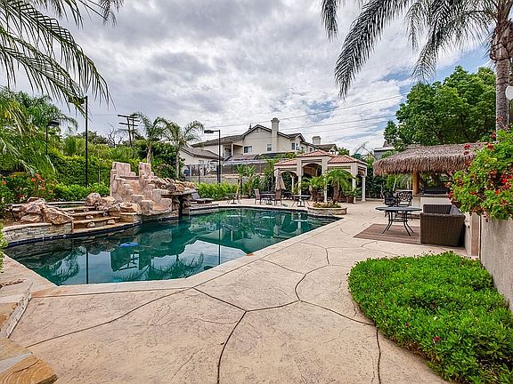 Stunning Mediterranean home is an entertainers paradise with resort like amenities. A grand entry with two leaded glass doors, soaring ceilings, and a large window in the dining area. The gourmet kitchen has double ovens, a walk-in pantry and a breakfast nook. Two living areas near the dining room each have a fireplace. A recreation room and an office with a built-in bookcase. A vibrant music studio room with a bathroom that has a separate entrance. Upstairs are four bedroom ensuites, a recreation room, vaulted ceilings throughout and a large window in the hallway. The largest ensuite has a wet bar, two walk-in closets, a large bathroom, and a balcony providing phenomenal views. Garage for 4 cars and a long driveway for additional parking. The home sits on almost an acre lot and has an automatic entrance gate, in equestrian area. Magnificent yard with a basketball court, putting green, lush landscaping, covered outdoor patio next to the pool with a waterslide, grotto and spa.