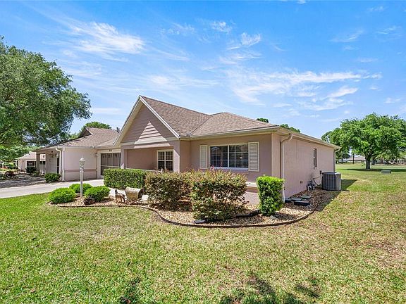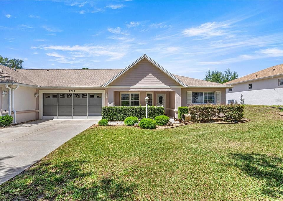 GOLF COURSE VIEW! We welcome you to view this stunning Wyngate model home, ideally located on the third hole of The Links Golf Course on a tree-lined street in the desirable Crescent Green neighborhood. Breathtaking views of the golf course can be seen throughout much of the house. The home features a charming front porch, luxury vinyl plank flooring throughout, neutral interior paint and a new roof installed in 2021. The expansive great room and dining room offer open concept living and flows seamlessly into the enclosed lanai. The split floor plan includes a spacious master suite with two generous walk-in closets. The master bathroom boasts dual vanities with quartz countertops, a large step-in shower and a linen closet. The updated kitchen is equipped with modern cabinetry, quartz countertops, stainless steel appliances, a reverse osmosis system and a cozy breakfast nook. Located in On Top of the World, Ocala’s premier gated 55+ community. Residents enjoy world-class amenities and golf cart access to nearby shopping, dining, and medical facilities. Plus, you’ll be just a short drive from the renowned World Equestrian Center. Schedule your private tour today—please note, verbal offers will not be accepted.