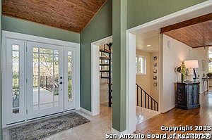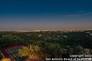 Unobstructed panoramic city view from one of the highest points in Bexar County! Exquisite, comfortable and unique home on 2 acres. Totally fenced with 3 wrought iron gates. Balcony view for miles welcomes you from entry & from every room! Blue bottom pool.Tennis court.Elevator from parking to main level. Over 2000 sf of wraparound Trex deck on 8 stone pillars. Hardwood & ceramic/natural stone tile floors.Vaulted wood ceilings. 15 ft granite brkfst bar. Bonus/craft room off game rm. His & hers master baths.