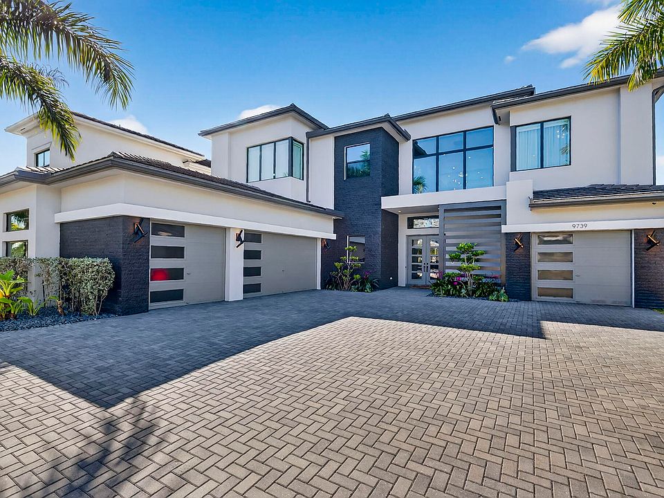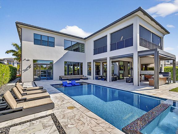 Located in Boca Bridges, one of the newest luxury communities, built in 2022, this exceptional estate blends modern elegance with resort-style living. Boca Bridges is a gated community offering a grand clubhouse, tennis and pickleball courts, basketball, fitness center, playground, and resort pool. The home features four upgraded garages with epoxy floors and custom storage, a modern elevator, circular driveway, and a fully integrated smart-home system. The primary suite offers his-and-hers custom closets and spa-style baths with multi-jet showers and soaking tub. Outdoor living shines with a custom Van Kirk pool, spa, fire features, and waterfalls, plus a private custom movie theater for ultimate entertaining. Not builder grade, lots of upgrades. Must see.