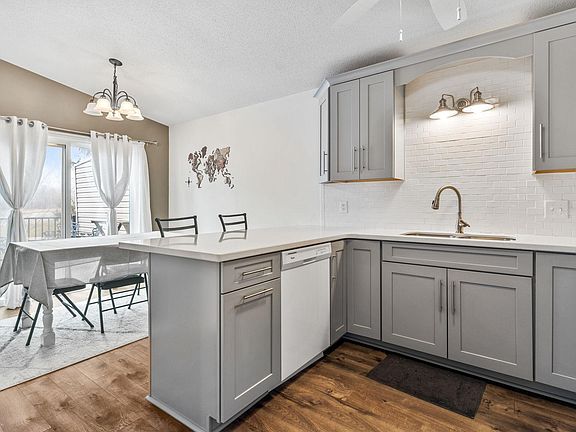 This move-in ready, end-unit townhome is a must see! Upper level features wood vinyl plank flooring throughout, vaulted ceilings and large windows allowing for plenty of natural light. Upgraded kitchen presents stunning tiled backsplash, quartz countertops, and convenient breakfast bar, accompanied by walk-in pantry. Spacious master bedroom provides direct access to bathroom, as well as large walk-in closet offering ample storage space. Finished lower-level includes a beautiful wood burning brick fireplace, walk-out patio area, remodeled 3/4 bathroom and laundry room.
