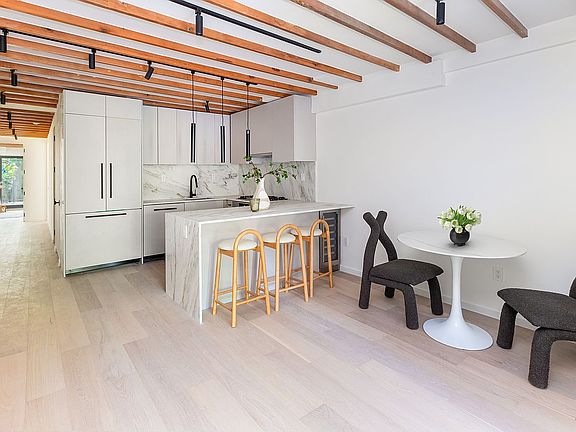 The home opens into a 36-foot-long living and dining area a truly massive space that invites both grand entertaining and everyday living. Exposed beams and sleek modern track lighting create a modern loft-like aesthetic, while the chef’s kitchen, outfitted with brand-new Bosch appliances and finished in imported marble, pairing beautifully with the cashmere color kitchen & wood beams.