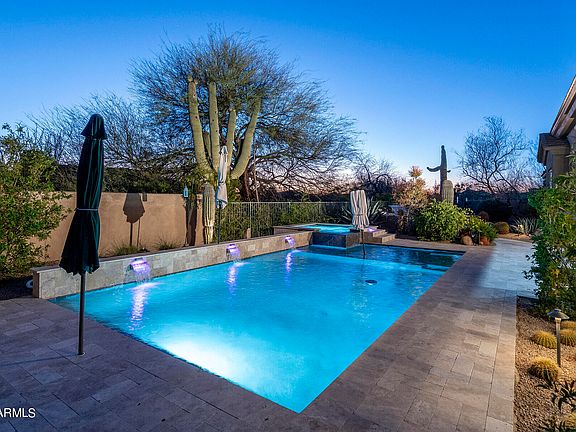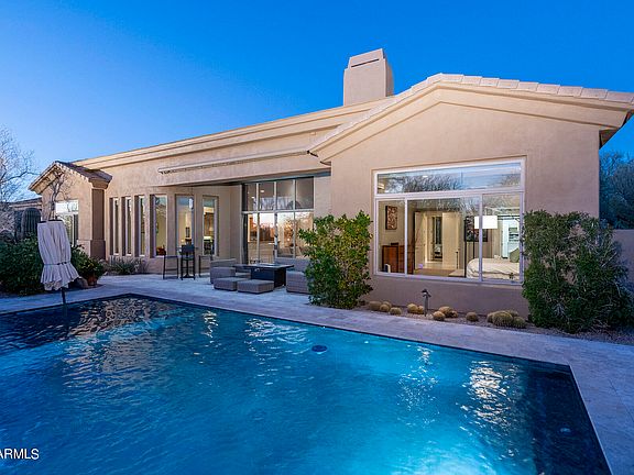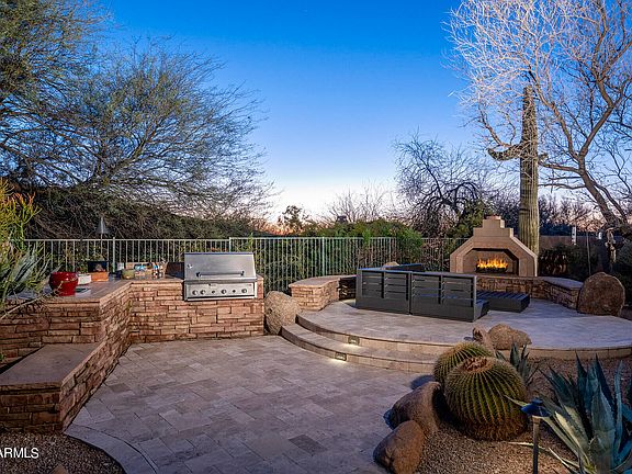 Luxury living awaits at the gated community of Monument in Troon North! Meticulously maintained, single-level gem with split floor plan, 3 beds, 3 baths, & a den/office (4th bed option). Gourmet kitchen features Viking appliances, granite countertops, a large island, & a beverage/wine fridge. Enjoy the cozy great room with fireplace & large sliding glass doors opening up to private backyard oasis & open space! Beautifully landscaped backyard includes newly redone pebble tech pool & spa, fireplace + lounge area, & a built-in grill, perfect for entertaining. Soaring 12' ceilings throughout, a split 3-car garage with storage, and seamless indoor-outdoor flow, this home offers both style and functionality.