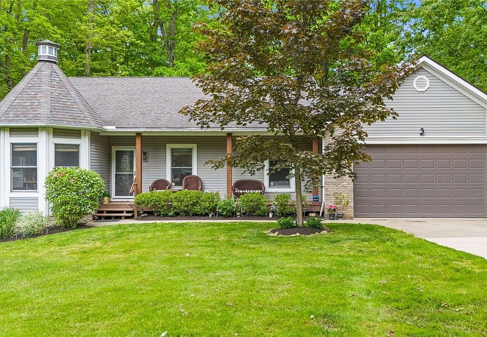 Incredible opportunity for a move-in ready home within 10 min of route 90 & route 44. Set back off the road, this 2002 ranch offers a functional layout and over 3,000 square feet of living space. The home abuts Geauga Park District land with no close neighbors. The driveway has ample parking including space for large RV. The covered front porch creates a welcoming entry to the home. Inside, the entry foyer features new luxury vinyl slate look plank flooring. The living room has vaulted ceilings, a stone wood-burning fireplace and opens to the formal dining. There is a large deck overlooking the park-like rear yard. The kitchen has brand new quartz counters, fresh paint, an eat-in nook & appliances are included with your purchase. There are two secondary bedrooms that share a full bath with new LVP flooring & vanity. The master suite has vaulted ceilings, a walk-in closet, large master bath w/recent refresh & huge tiled shower with dual shower heads. There is also a private deck for sipping your morning coffee. Laundry options both on main floor & in lower level. The garage is oversized (21' x 26') with 11' ceilings, a 9' door & will fit a large truck as well as staircase to lower level. The lower level features options for multi-generational living. The large family room has new luxury vinyl plank flooring & a stone wood-burning fireplace. There is a bedroom with exterior access to a patio area under upper deck and a newer hot tub for your entertaining enjoyment. The home has a 5th bdrm option, currently being utilized as a gym w/rubber flooring. A full bath with walk-in shower on this level as well as unfinished storage area that offers the second laundry room option. This home suits so many different lifestyles, the exterior is low maintenance and there is a large private stone fire pit area for outdoor hangs. Recent updates - HVAC (2024), driveway, most flooring, vanities in master & main level bath, quartz counters & backsplash in kitchen, storage shed & more.