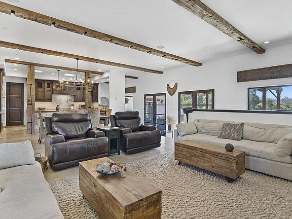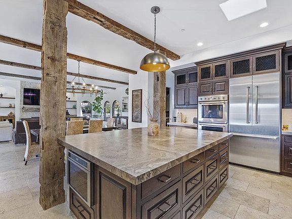 Custom built Spanish style home situated on over an acre of privacy in Aptos. With a generous 2,732 SF floor plan, PLUS a beautiful separate 1,350 SF 2 bed/2bath guest unit, this home provides an inviting and functional layout. Designer kitchen features Quartz countertops, Wolf built-in oven range with gas, Asko dishwasher, an Extra Large pantry, Thermador refrigerator and Travertine tile floors. Custom 200 year old beams, Honed marble Island. The dining area and eat-in kitchen provide ample space for family meals. Large formal living room with fireplace, vaulted ceilings and hardwood floors. 6 zone Radiant floor heating, skylights, and a video/audio system, ensure comfort and convenience. The spacious primary suite includes a walk-in closet, along with a bathroom that features an oversized tub and double rain shower. Additional amenities include a built-in vacuum system, saltwater hot tub, Finnelo sauna. The elegant flooring complements the home's aesthetics and style of the home by fitting in well with its existing design elements creating a cohesive and pleasing look while the cozy fireplace adds warmth. Indoor laundry area with tub, sink, washer, and dryer. 2-car garage with extra storage, solar, whole house generator, and other essential structures for modern living.