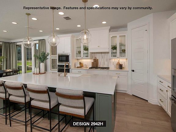 Home office with French doors set along one side of two-story entry. Kitchen and dining area open to two-story family room. Kitchen features corner walk-in pantry, 5-burner gas cooktop and generous island with built-in seating space. Two-story family room features wall of windows. First-floor primary suite includes bedroom with 10-foot ceiling. Double doors lead to primary bath with dual vanities, garden tub, separate glass-enclosed shower and large walk-in closet. First-floor guest suite offers private bath. Game room and two secondary bedrooms are upstairs. Extended covered backyard patio and 5-zone sprinkler system. Mud room off three-car garage.