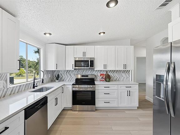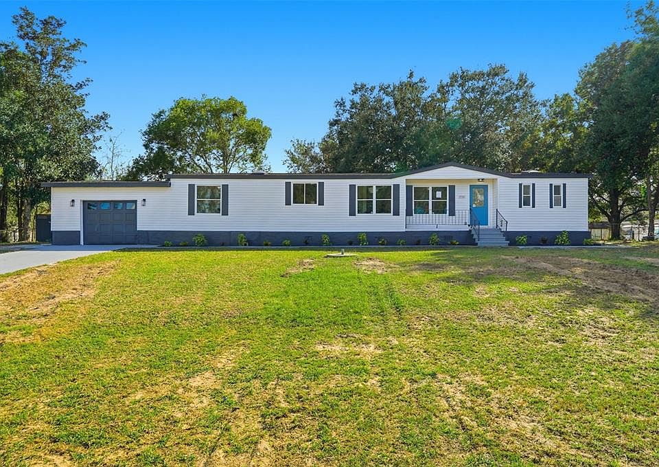 **Fully Renovated 3 Bedroom, 2 Bath Home with Oversized Garage on Half Acre in Dade City – No HOA, No Flood Zone** Welcome to this beautifully updated 3-bedroom, 2-bathroom manufactured home sitting on over half an acre (.52 acres) in peaceful Dade City. This property offers a rare combination of modern upgrades, open space, and functionality — complete with an oversized garage perfect for storage, hobbies, or parking a vehicle. Step inside to discover a completely remodeled interior featuring luxury vinyl tile flooring throughout, a brand-new kitchen with white real wood shaker cabinets, dovetail soft-close drawers, soft-close doors, quartz countertops, a modern herringbone glass backsplash, and stainless steel appliances. Both bathrooms have been tastefully renovated with stylish finishes, new vanities, and updated fixtures. The primary bathroom has free-standing soaking tub with separate shower, spacious vanity with quartz countertop and separate water closet (toilet). Enjoy fresh paint inside and out, a new roof and newer A/C, and upgraded lighting throughout. The open split floor plan provides plenty of natural light and comfortable living spaces for family and guests alike. Outside, the spacious .52-acre lot provides room to relax, enjoy time around the large brick fire ring, garden, or add outdoor amenities — all with no HOA restrictions. Conveniently located near charming downtown Dade City, shopping, and local dining, this home blends peaceful living with modern comfort. Schedule your private showing today!