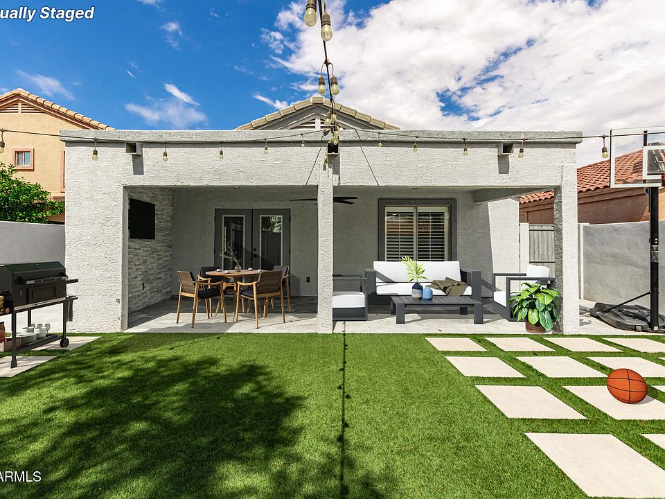 Modern finishesFresh interior paintSpacious islandLarge covered patioQuartz countertopsSynthetic grassDesigner tile