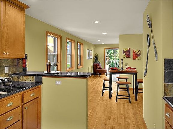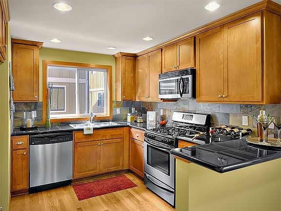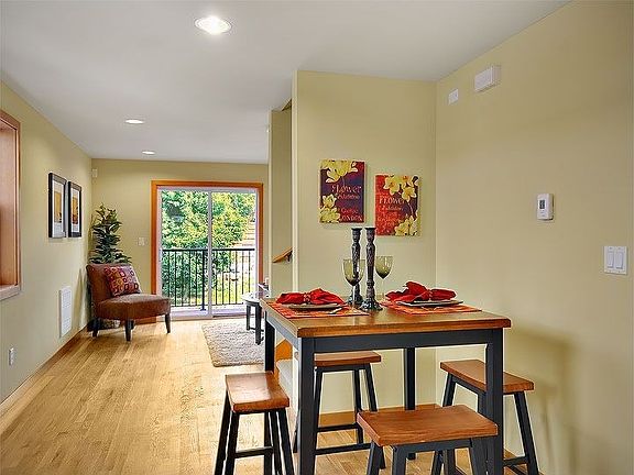 Beautiful three-story townhouse in Seattle / Greenwood is available in October! Built green, it features an open kitchen and gas stove with granite countertops and new appliances. Hardwood floors can be found throughout the main level with a balcony overlooking the privately fenced backyward and patio. Other amenities include vaulted ceilings, washer and dryer, attached garage with ample neighborhood parking, and a 99 walkscore. Location in back of complex offers quiet and privacy. Owner pays for garbage and sewer.