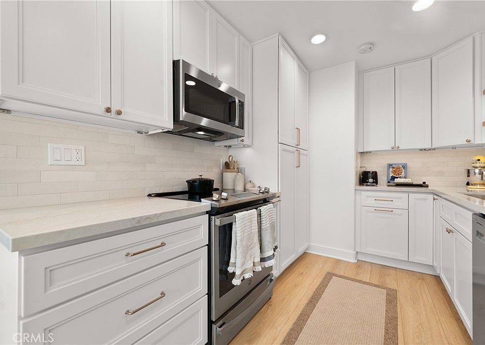 Step inside to discover an open-concept living area with plenty of natural light due to a west facing backyard and double height front windows with wireless blinds. The updated kitchen features stainless steel appliances, custom cabinetry, floating shelves with LED lighting, and pristine quartz countertops, perfect for preparing meals or entertaining guests. The custom floating staircase made of solid white oak whisks you up to the second floor bedrooms. Both bedrooms are spacious, with floor to ceiling closets with custom organizers and a fresh, contemporary design.