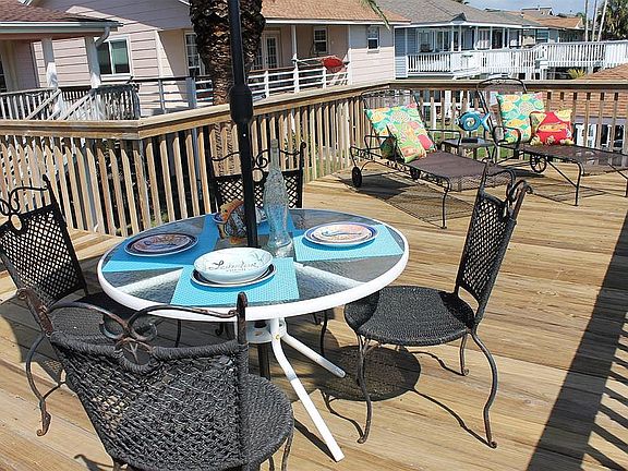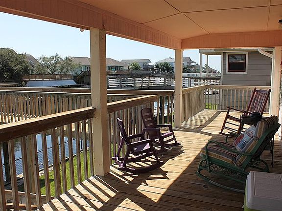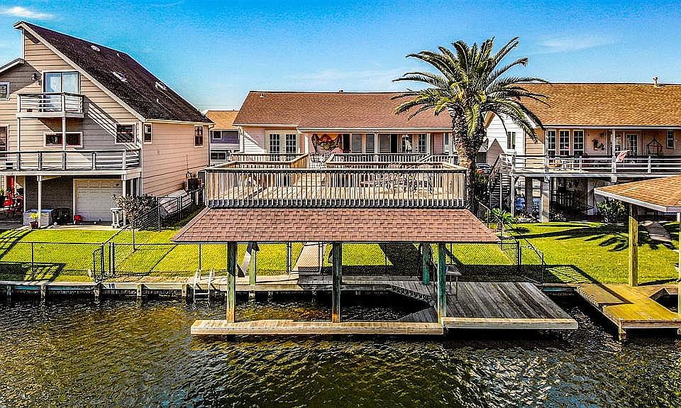 This fun East facing waterfront home could be yours. Enjoy having your boat at your door step. The great outdoor spaces make for fun times with family & friends. Back yard is fenced. High vaulted ceilings in living room make this open concept living a pleasure. French doors & floor to ceiling windows out to the water. Breakfast bar and eat in dining room. Laminate floors through out with tile in wet areas. Two bedrooms up, 1 with doors out to the deck. Dreamy remodeled bath with walk in shower. [You will LOVE the luxury quartz counters in both baths.] Downstairs you will find guest quarters with another updated bath and laundry area. Entire downstairs floor is wood-look tile for easy care. Sliding glass doors out to the covered patio area and the water. Seller is looking for offers! Bayou Vista is a great place to live full time or vacation!!