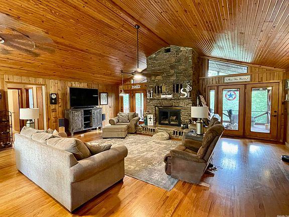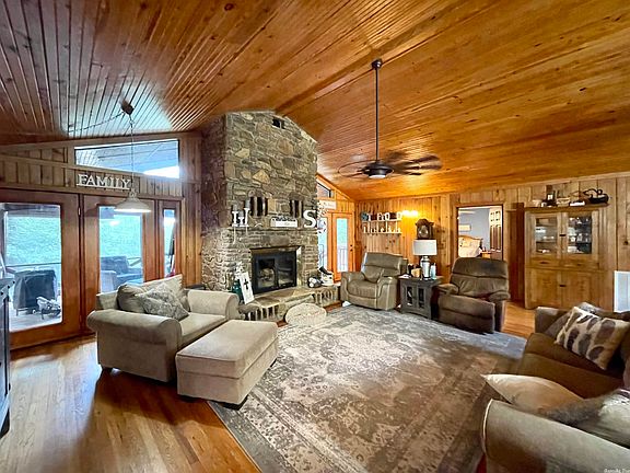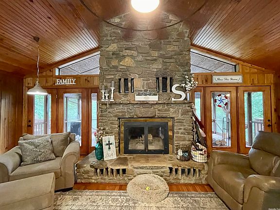 Rustic Style Home and 15 acres in Mountain View!! This beautiful home features 4 bedrooms, 3 bathrooms and a large open living area with vaulted wood ceilings, native stone wood burning fireplace, and an updated kitchen with stainless appliances, granite countertops, & pantry. The Master Suite offers a large bedroom, private deck, full bathroom with laundry room, and walk in closet. Two guest bedrooms and bathroom are separate from the Primary Bedroom. The Basement features a 4th bedroom, craft room, or family room with a full bathroom! The Basement has an awesome wood working shop with lots of storage space along with a garage, making this the ultimate man cave! The back deck features a large screened in porch with vaulted ceilings as well as two open decks. There is a hookup for RV and parking pad. The roof was just installed (2023) The property is all wooded and very private, but close to the Famous White River, creeks, and downtown Mountain View! Call today to view this home!