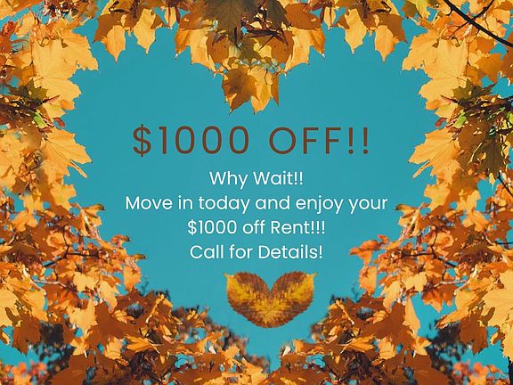 - Special offer! $1000 off Rent! Call to find out how! Must move in before 11/15/2025.Expires November 15, 2025