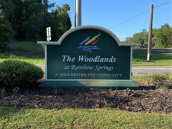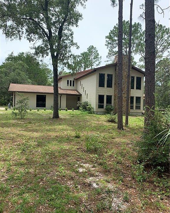 This three bedroom, two bathroom home sits on 1.08 acres, which includes three large Magnolia trees in bloom with pine trees that provide shade and privacy. A two car garage with a separate detached garage gives a three car garage in total. This two story home has a balcony off the master bedroom on the second floor for privacy, a master bath and a large closet area. This home boasts gorgeous cathedral ceilings with wood beams and a large fireplace. Kitchen comes fully equipped with electric stove top, wall oven and refrigerator. Large lanai has all new double paned windows with easy glide and windows throughout the house are new. This home is located close to shopping, golf courses and the beautiful Rainbow River.