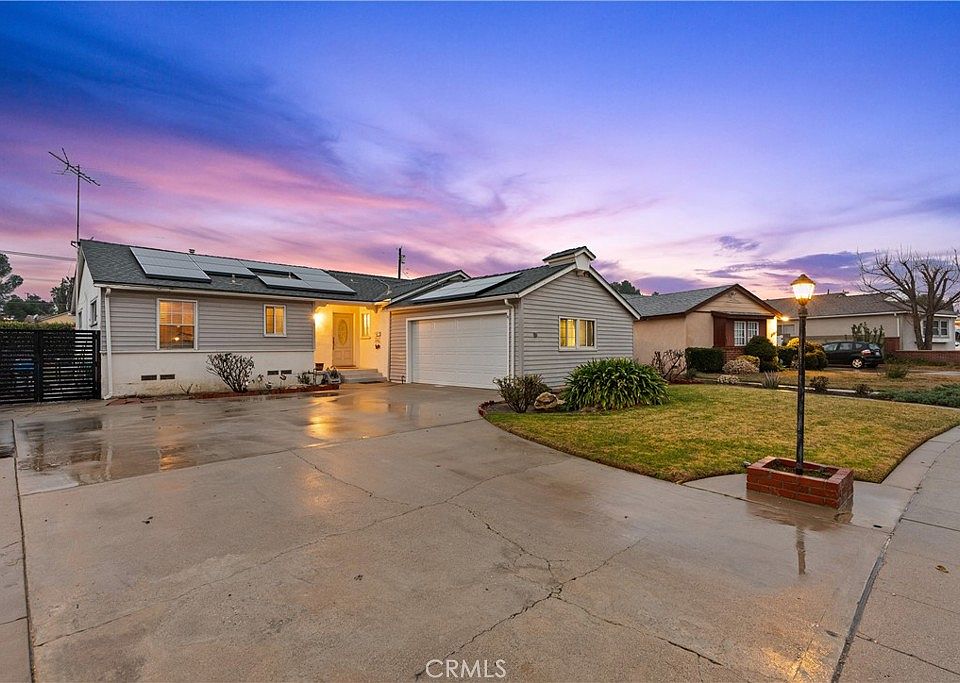 Welcome to this charming mid-century home, situated in a desirable Northridge neighborhood on a peaceful cul-de-sac street. This property offers 3 spacious bedrooms, 2 beautifully remodeled bathrooms, and a fantastic layout that perfectly blends entertainment and relaxation. As you step inside, you'll be greeted by an open floor plan, with wood floors throughout the living areas, enhanced by recessed lighting. The inviting living room features a sliding door that opens to the backyard, showcasing the sparkling pool and providing seamless indoor-outdoor living. The updated kitchen is a true centerpiece, complete with quartz countertops, stainless steel appliances, and plenty of storage space. It opens to the living room, making it ideal for entertaining guests while you cook. The kitchen features a gas range, electric oven, microwave with a vented hood, dishwasher, bar seating, and a cozy breakfast nook. Convenience is key with an indoor laundry room, complete with additional storage and direct access to the backyard. Step outside through the sliding door, and you’ll find your private backyard retreat. A sparkling pool, large grassy area, and covered patio create the perfect setting for summer BBQs, poolside lounging, or relaxing after a swim. The spacious primary bedroom offers a ceiling fan, ample closet space, and access to the remodeled full hallway bathroom with a beautifully tiled shower over the tub and a quartz vanity. The two additional bedrooms are generously sized, bright, and feature plenty of closet space. The remodeled 3/4 bathroom is easily accessible from the third bedroom and includes a custom-tiled stall shower and a quartz vanity. This home also boasts numerous updates, including most copper plumbing, updated sewer cleanouts, interior raised-panel doors, central air and heat, and a upgraded 200-amp electrical panel. The energy-efficient, assumable lease solar power system ensures reduced utility costs. The two-car attached garage with an automatic door opener and a large concrete driveway offer plenty of parking space. Located just minutes from CSUN, schools, shopping, restaurants, and major freeways, this home is the perfect place to create lasting memories with family and friends.