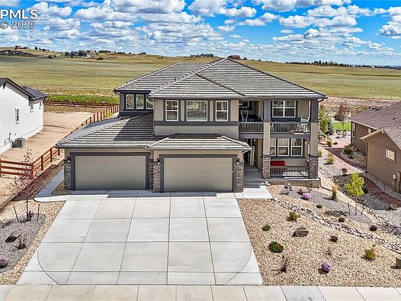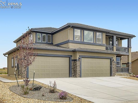 Wake up to breathtaking Pikes Peak views in this TimberRidge Grand Mesa estate offering 7 bedrooms, 6 baths, and over 5,200 sq ft of luxury living. The stucco and stone exterior set the stage for elegant interiors with hand-troweled walls and thoughtful design. The gourmet kitchen features Urbane Bronze cabinetry, Moon White granite counters, stainless appliances, an expansive walk-in pantry, and a pocket office. A main-level guest suite with private bath provides ideal space for visitors or multi-generational living. Upstairs, the serene primary retreat boasts a freestanding tub, rainfall shower with dual heads, custom walk-in closet, and private deck overlooking the mountains. Four additional bedrooms complete the level. The finished basement expands the home with a spacious rec room, two bedrooms, and full bath—perfect for entertainment or extended family. Comfort and function shine with wood closet shelving, central A/C, Smart Home package with leak detection, radon mitigation, and a 75-gallon water heater with recirculating pump. The oversized, insulated 4-car garage is fully finished, while the backyard is designed for year-round enjoyment with xeriscaping, extended concrete patio, gas firepit, garden beds with drip irrigation, a basketball/pickleball court, and gas line rough-in for a grill. Additional highlights include a Heat ’n Go fireplace with remote, upstairs laundry with sink, concrete tile roof, and hot tub pre-wire. Blending mountain views, thoughtful details, and premier amenities, this TimberRidge gem is the perfect balance of luxury and lifestyle—schedule your private showing today.