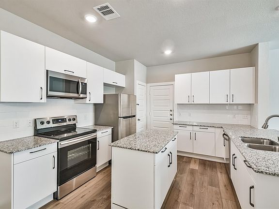 Granite countersStainless appliancesCovered back patiosTile backsplashIsland kitchens