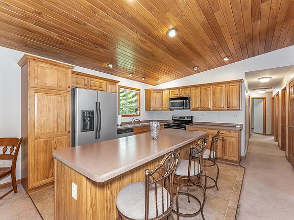 This home is sure to check all the boxes if you're looking for an off-water home on a 1.5 acre lot that is located only minutes from downtown Minocqua. The main floor offers open concept living with a gas FP, dining area with patio doors to the deck and kitchen with an abundance of hickory cabinets, an island and updated SS appliances. Down the hall you will find a pantry, laundry/mud room off the garage, full bathroom with a tub, 2 guest rooms and a primary suite with double closets. The inside has some fresh paint and professionally cleaned carpets. The walk out lower level offers a family room, wet bar w/ refrigerator, bonus room/bedroom with patio doors and another full bathroom. There is plenty of space for storage too with built in shelves. The one owner of this well cared for home was a master craftsman and the majority of the cabinets and doors were custom made. Outside you will find a landscaped yard, deck, patio and a spacious lot. Heated garage + Spectrum!