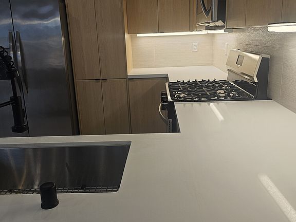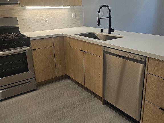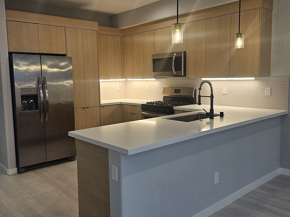 Spc flooringWhite quartz countertopsOpen floor planStainless steel appliancesModern wood frameless cabinetry