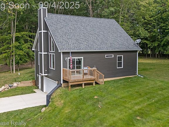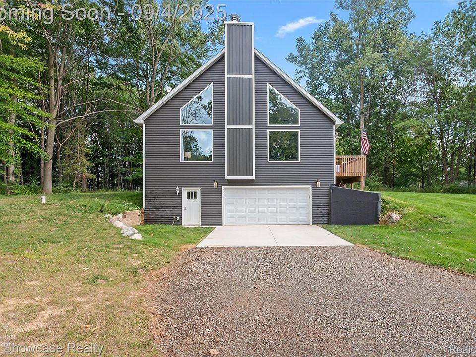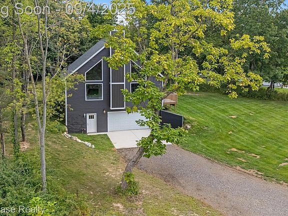 BETTER THAN NEW - QUALITY BUILT IN 2024. THIS CUSTOM CONTEMPORARY IS CLOSE TO CHARMING DOWNTOWN FOWLERVILLE, LOCATED ON A QUIET DEAD END STREET AND SITUATED ON A LARGE (1.56 ACRE) PRIVATE, WOODED LOT! THE RANCH HOME FEATURES A STUNNING OPEN FLOOR PLAN, FIRST FLOOR LAUNDRY, ATTACHED 2 CAR GARAGE AND DECK! The Great Room, Dining and Kitchen feature a soaring (23 foot) cathedral ceiling! A wonderful wood burning fireplace with wood mantel is situated between striking windows extending from the floor to the ceiling. The Dining Area includes a door-wall leading to the deck. Gorgeous Kitchen is furnished with attractive shaker cabinetry, beautiful quartz counters, stainless steel appliances and Island/Prep Station with snack-bar counter. The spacious Primary Bedroom includes a ceiling fan with light and access to a large Bath featuring a walk-in jetted tub, vanity with quartz counter and laminate flooring. First floor Laundry Room is equipped with a washer, dryer, utility tub and vinyl flooring. The lower level offers a Flex Room, Utility Room with HE Furnace and HE Water Heater and access to the oversized Garage equipped with a floor drain.