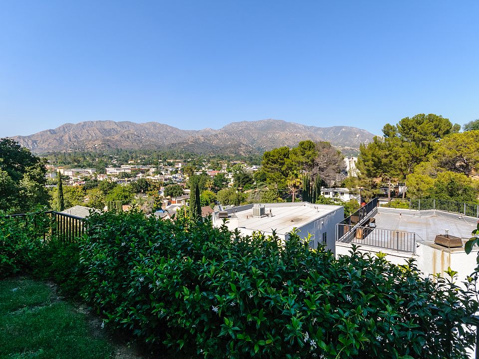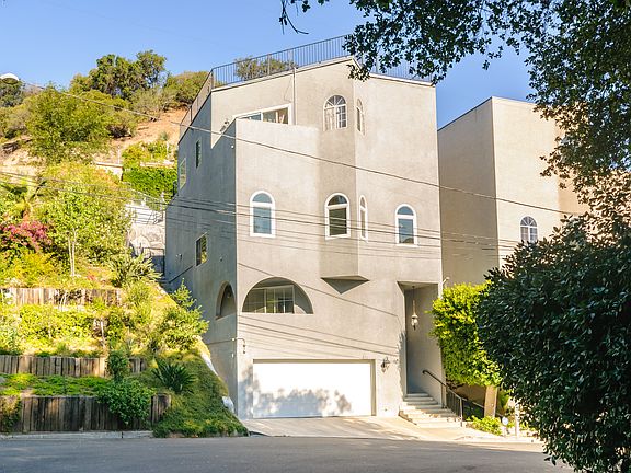 VIEW WITH A HOUSE This four level modern has views of the tree tops and surrounding mountains and city lights from almost every room. It is located on a very quiet street. Built in 1993 with copper plumbing, stucco exterior, double pane windows and sliders and a 200 amp panel. The flooring is tile and engineered hardwood. There are three bedrooms each with their own bathroom. The kitchen has tile floors, granite counter tops and stainless steel gas range, dishwasher, refrigerator, microwave/vent and sink, high ceilings, recessed lighting and pantry. The Master has a walk-in closet, a second closet and its own private balcony. The master bath has separate tub and shower with two sinks. The office has a sliding door to the outside spiral staircase that leads to the Zen-like roof area. The back yard is unique beyond belief with a pool/spa/waterfall and a covered patio and views to relax and enjoy.