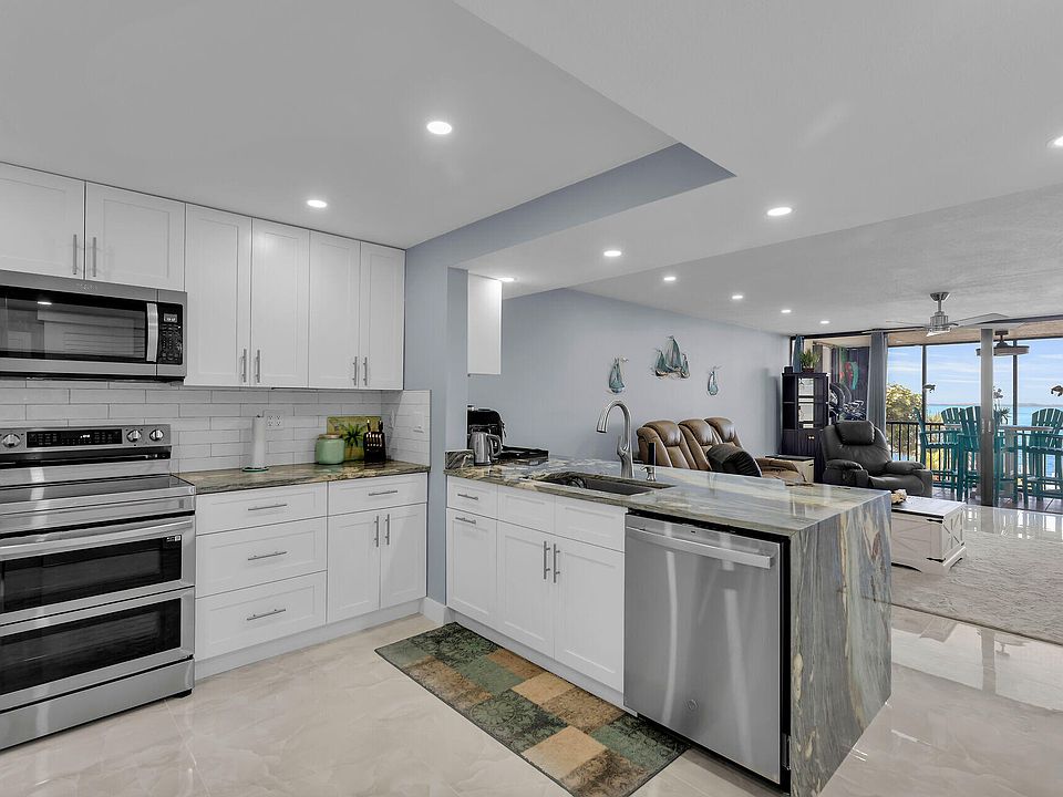 Open Water Views ..NEW-Kitchen- New-Flooring New-Bathroom & Custom Doors....Complete stunning interior renovations Bayfront Beach Views... 2 bed/2 bath condo in Key Largo offers expansive open bay views, a wide sandy beach, bayfront clubhouse, boat storage barn, pool, tennis courts and acres of shady tree-lined streets and paths throughout the community. Rock Harbor Club's Harbor House condo is known for its multi-million dollar views, nightly sunsets, and the peace and quiet you expect in the Florida Keys! This second floor condo offers single level living (no stairs), and 32 feet of glass patio sliders to frame the Florida Bay view. The unit also offers a large primary bedroom with end suite bathroom and walk-in closet, plus a comfortable guest bedroom with a large wall closet, full bath, washer/dryer, and an enormous hall storage/pantry closet. The screened in patio provides a spacious outdoor living area, and the exterior landscaping provides a feeling of a peace and privacy rarely felt in a condo. Community amenities include a clubhouse with a full kitchen, TV, reading/lounging area, sauna, and a gas fire pit to enjoy sunsets with friends. There's also paddle board and kayak storage, bike racks, boat dockage (check for specific availability and restrictions; 21' space available now) up to 26'6' LOA with fork lift service to the dry storage boat racks, plenty of parking, and a serene location. This turn-key property is super clean and close to many local restaurants, luxury resorts, easy shopping, and ready to enjoy the Keys lifestyle.