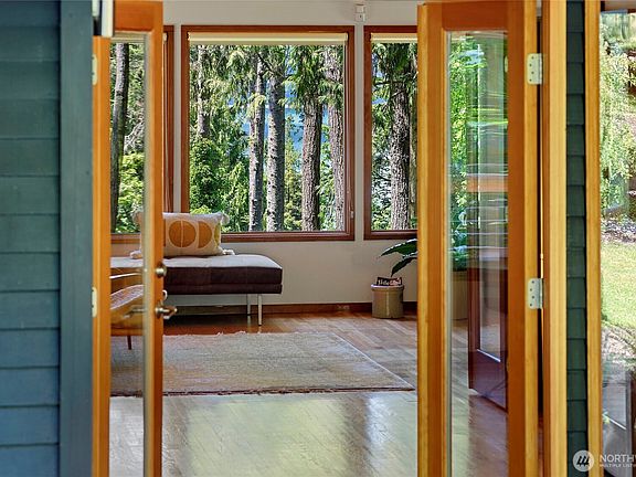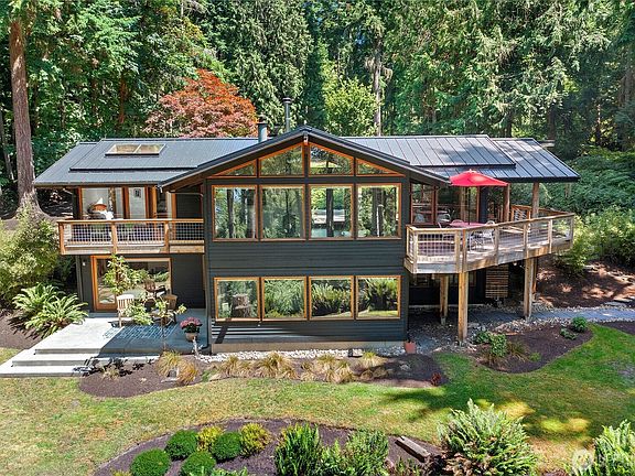 Experience the perfect balance of light and trees as you meander the private driveway amidst 200 year old grand firs and arrive at the inviting and stylish front entry of this Rustic Modernism home. With its delightful park-like setting on 1.5 acres, you'll enjoy stunning sunsets, filtered water views and the brightest light from soaring walls of west facing windows. Enjoy the spacious open floor plan with hardwood floors and skylights on the main floor, including the primary bedroom. Additional bedrooms, bonus room, and separate entries on lower floor. Close proximity to beach and the wonderful 90 acre Battle Point Park and Grand Forest.