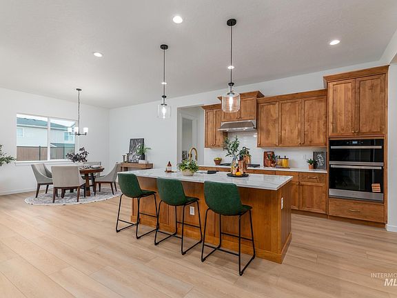 "The Bannock" exudes contemporary comfort and functionality, exemplified by its thoughtfully crafted single-story layout. A long foyer sets the stage, leading to a spacious great room seamlessly connected to the kitchen, casual dining area, and covered patio—an ideal setting for gatherings and relaxation. The kitchen is centered around a striking large center island and enhanced by its expansive walk-in pantry. The primary bedroom suite, nestled in the rear of the home, features a serene sanctuary complete with a luxurious walk-in closet and a primary bath with separate vanities, and a luxe shower. Off the foyer, you'll find a private home office, powder bath and two secondary bedrooms with shared hall bathroom offering privacy and comfort. 3 car garage. Front and rear landscape included. Home is under construction and photos are similar. BTVAI