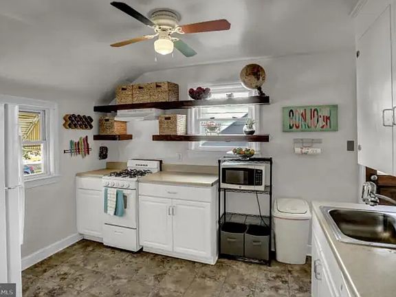 The kitchen offers all your essentials and quick access to the backyard for outdoor dining or grilling.