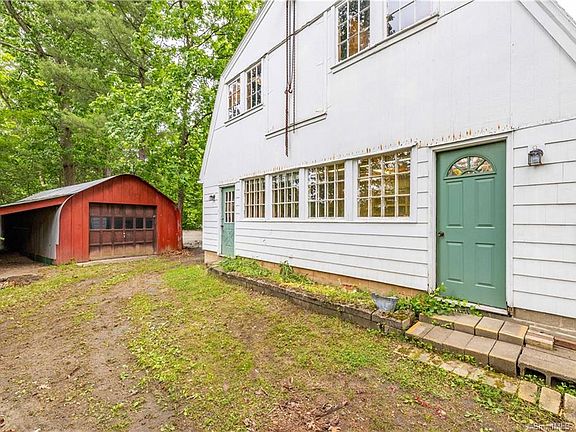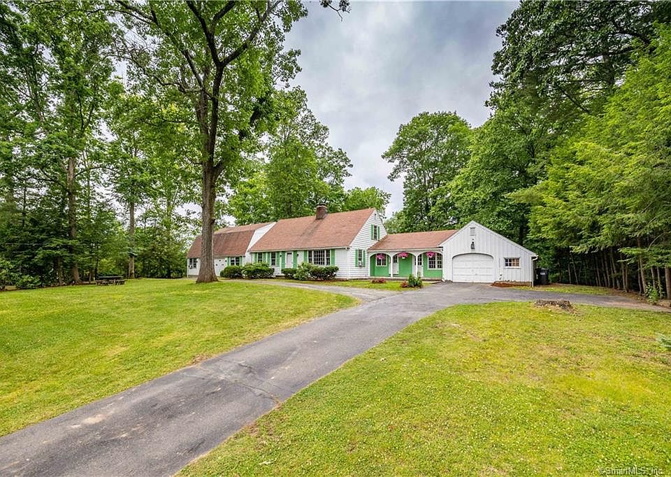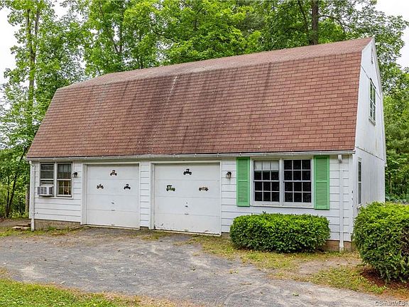 Spacious Suffield Cape Cod situated on private 2 acre lot w/awesome 2 story 1000 sq ft separate barn/garage w/heated workshop (radiant heat in floor was drained/shut off professionally years ago and not currently in use, appears to have 200 amp electric, air compressor. Additional 13x29 outbuilding in back plus attached garage to house. Tons of storage. Cute storybook Cape has front porch, breezeway and nice open floor plan. Hardwood floors throughout, large rooms, fireplaced living room open to kitchen and dining room. 2 bedrooms on 1st floor have potential to become 1 master suite. 2 large bedrooms upstairs. Brand new heating system and hot water heater. Home does need some work and updating and is priced accordingly. Property is being Sold As. By appointment only.