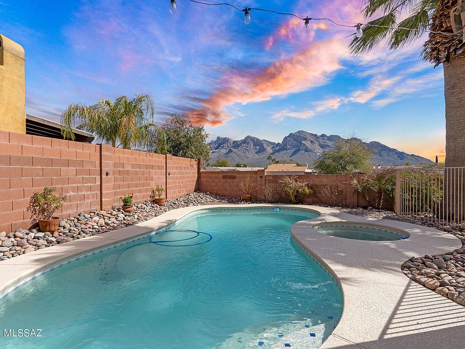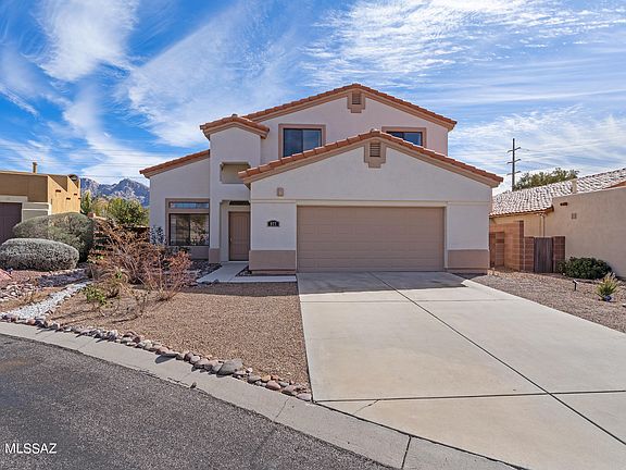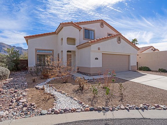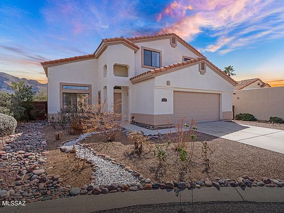 Beautiful fully remodeled home located in the Villages of La Canada gated golf community. Nestled between a cul-de-sac, and wash, surrounded by one story homes, with unobstructed majestic views of the Santa Catalina's. Relaxing outdoor living area with 2 covered patios that overlook tropical landscaping and a sparkling pool with spa. The fully updated custom kitchen features quartz countertops, new cabinets, stainless steel Kitchen Aid appliances, an island that overlooks the backyard and peninsula counter seating. A cozy family room features a modern fireplace and patio access. The front entry way cathedral ceilings welcome you to the living and dining rooms including large windows that frame the scenic backyard. Sip coffee while watching sunrises on the newly refinished owner's veranda or stargaze in the evenings. The owner's suite is complete with a spacious walk-in closet and brand new custom en-suite including a freestanding soaker tub and large master shower that embrace palm trees and mountains. Three more bedrooms are located upstairs with access to a thoughtfully remodeled full bath. The home is complete with porcelain nonslip wood grain tile throughout the first floor and bathrooms. The attached oversized two car garage offers ample storage, with a new garage door and large driveway. All entry doors have been replaced, newer hot water heater and A/C unit, all appliances convey.