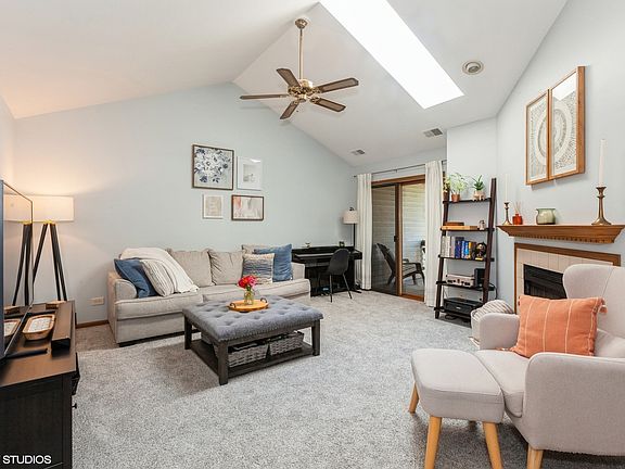 Welcome to 977 West Ct C in the Creekside Condo community and discover a cozy retreat with modern updates. This home features two large bedrooms with a walk-in closet, two full baths, and an attached garage. The interior boasts timeless paint colors, blinds on all windows, and updated lighting. The kitchen is a standout with its tile backsplash, Corian counters, and wood laminate flooring. The master bathroom looks straight out of a design magazine and includes a skylight and new tile flooring, shower, vanity, lighting and faucets. A spacious living and dining area with gas fireplace and impressive vaulted ceilings is where you'll spend most of your time making memories. Enjoy your morning coffee or relax in the evenings on the covered balcony. A laundry room is included with washer and dryer and mechanicals. Other recent updates include an AC unit installed in '20, water heater in '17 and carpet in '23. Monthly assessment covers water, lawn care, snow removal, and all exterior maintenance. The current owners have enjoyed the condo's practical layout, proximity to downtown and the nearby park. Creekside Condos in Naperville offer the perfect combination of comfort and convenience. Located near major expressways and public transit, these condos are also within walking distance of the highly regarded Naperville North High School and Mill Street Elementary. Whether you're seeking a vibrant community close to all the action or a quiet, low-maintenance community, 977 West Ct C is where it's at!