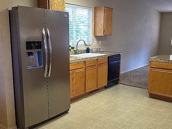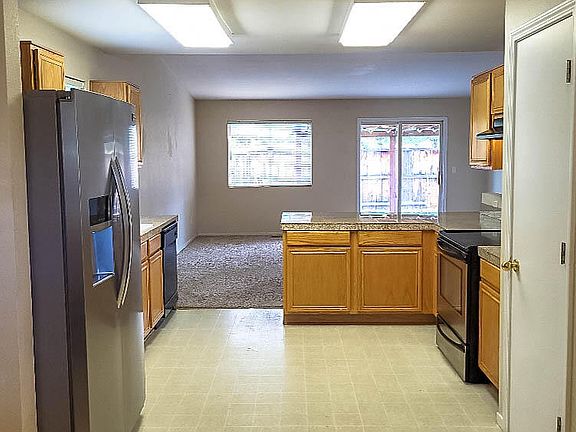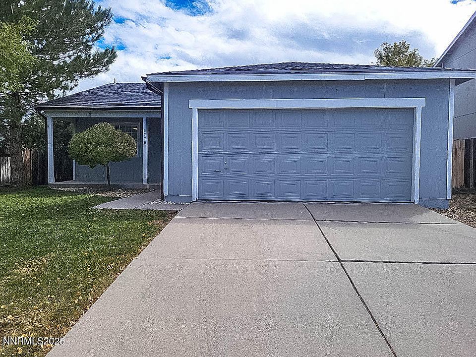 Back on the market, this comfortable 3 bedroom 2 bath home in Stead is priced to sell, as-is. A few handyman touch ups still needed. Fully fenced and landscaped backyard with covered cement patio, mature trees including a fruit bearing peach tree. Front yard is also fully landscaped with a covered porch. Carpeted throughout, with luxury vinyl flooring in the kitchen and bathrooms. Open-space kitchen design and breakfast counter, with a perfect fit dining table and chairs included. Stainless steel refrigerator, stove, microwave, dishwasher, washer and dryer stay with the home. Two car garage with dog door to the back yard.