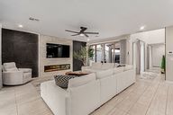 Sleek tile floorsBackyard offers poolQuartz countertopsClean landscapingGrass areaDual primary suitesTiled entertainment wall