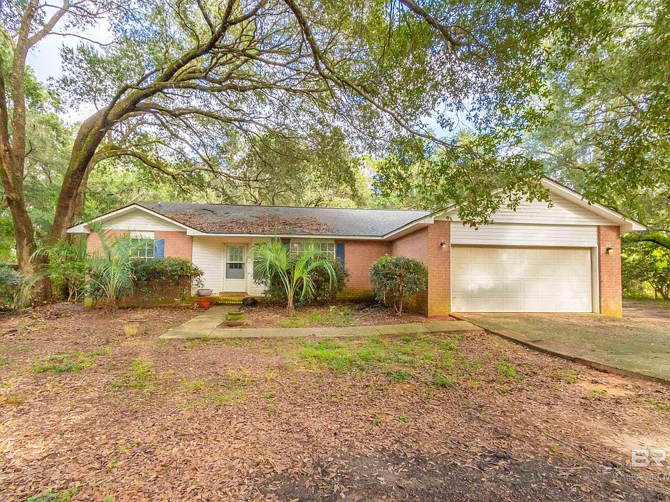 Welcome home to this charming 3-bedroom, 2-bathroom residence with a versatile flex room, all perfectly situated on a beautiful 1.5-acre lot surrounded by mature trees. The home features a desirable split floor plan and a kitchen complete with stainless steel appliances. The large primary suite offers a walk-in closet and an ensuite bath with a double vanity, soaking tub, and separate shower. Enjoy peaceful mornings and evenings from the screened-in back porch overlooking a fenced backyard, complete with two storage buildings and a private well for water. Additional highlights include a double-car garage and plenty of space to expand or create the perfect outdoor retreat. While the property could benefit from some TLC, it offers incredible potential as either an investment opportunity or a family home for those seeking room to roam and the tranquility of country living—just a short 30-minute drive to Gulf Shores Public Beach. Buyer to verify all information during due diligence.