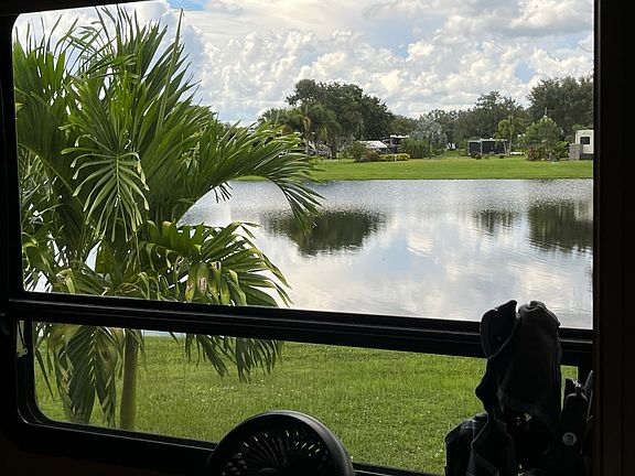 RV Site surrounded by beautiful palm trees on the shore of fountain view lake. Electricity and water hookups on site. Pets welcome! RV resort amenities include dog park, playground, swimming pool, restroom/shower facilities, picnic area, boat launch, free cable tv, putting green, pickle ball court volleyball, bocci ball and more. Easy access to fishing piers on the Peace River and beautiful views throughout the resort. Short and long term rentals available.