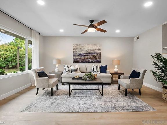 Welcome to your new home nestled in one of Tierrasanta's most desirable neighborhoods! Recently renovated with a designer's attention to detail, this residence offers contemporary living at its finest. The kitchen has been tastefully updated with new cabinets, quartz countertops, and high-efficiency appliances, creating a stylish and functional space for culinary enthusiasts. Featuring four generously sized bedrooms and two and a half baths (half bath on first floor), this townhome provides ample room for both relaxation and entertainment. Natural light floods the interior through newly installed dual-pane windows, complemented by recessed lighting and elegant wide-planked luxury vinyl flooring in a blond tone. Stay comfortable year-round with the addition of a state-of-the-art HVAC system and ceiling fans. For the environmentally conscious homeowner, the garage is equipped with an EV charger outlet, offering convenience and sustainability. Step outside to your private patio oasis, complete with a thriving garden and secure access to the surrounding greenery. Situated between the community tennis courts and pool, and conveniently located just a mile from the 15 freeway, this home offers both tranquility and accessibility. Renowned for its top-rated schools and tight-knit community, Tierrasanta is a sought-after destination for discerning homeowners and families. Don't miss the opportunity to make this impeccably updated property your own!