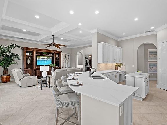 Live the Ultimate Vacation Lifestyle in The Quarry! This stunning home in the prestigious Quarry community offers the perfect blend of luxury and relaxation. Boasting 4 spacious bedrooms plus a den, 3 full baths, and an extended 2-car garage, this home provides over 3,000 square feet of living space designed for comfort and style. From the moment you step through the elegant glass front doors, you are welcomed by an expansive great room floorplan, featuring a 16' pocketing sliding glass door that opens to the lanai, seamlessly blending indoor and outdoor living. The gourmet kitchen is a chef’s dream with a center island, an abundance of cabinetry, brand-new quartz countertops, a large counter-height breakfast bar, and both formal and informal dining areas, making it ideal for entertaining guests or enjoying family meals. The luxurious master suite offers a private retreat with a sliding glass door to the lanai and a spa-like bath featuring dual vanities, a walk-in shower, and a soaking tub – perfect for unwinding after a long day. Step outside to the expansive lanai and enjoy breathtaking sunsets with the home’s direct west-facing rear exposure. The heated pool with raised spa, built-in outdoor kitchen with grill & hood, and a bar table create the ultimate outdoor living space for relaxing or hosting friends and family. Additional highlights include a NEW ROOF (2021), updated HVAC units (2021 & 2018), freshly painted interior (walls, doors, trim, ceilings), electric roll-down hurricane screens on the lanai, freshly painted interior and exterior, brand-new quartz countertops throughout the kitchen and baths, central vac, electric ceiling storage racks in the garage, whole house Kinetico water treatment system, and brand-new European White Oak wood floors in the bedrooms. Other fine details include updated chandeliers, fans, and bath fixtures, a central vacuum system, plantation shutters on all windows, 7" crown molding, and a finished garage floor. The Quarry is an exceptional lakefront community offering unparalleled amenities and a lifestyle like no other. Enjoy boating, golf, tennis, pickleball, bocce ball, a Tiki Bar, poolside food and drink service, a fully equipped gym, and a variety of social activities. The recently renovated and expanded “Lake Lodge & Beach Club” provides the perfect setting for relaxation, while over 500 acres of navigable lakes (with boat slips available for lease) offer endless opportunities for water enthusiasts. The private 18-hole golf club features optional golf and social memberships, providing an elite experience for golf lovers. Don’t miss the opportunity to own this incredible home with a transferable full golf membership and experience the resort-style living that only The Quarry can offer. Schedule your private showing today!