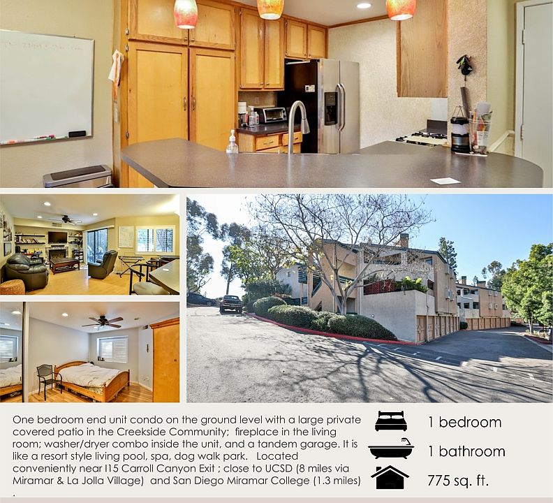 One bedroom end unit condo on the ground level with a large private covered patio in the Creekside Community; fireplace in the living room; washer/dryer combo inside the unit, and a tandem garage. It is like a resort style living pool, spa, dog walk park. SOLD AS IS. Bring your own imagination to make the place a perfect for living. Located conveniently near I15 Carroll Canyon Exit ; close to UCSD (8 miles via Miramar & La Jolla Village) and San Diego Miramar College (1.3 miles) .