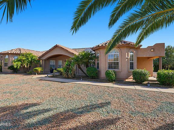 This custom acre-lot home is a perfect marriage of energy efficiency & luxury. Owned solar only 5-yrs-old supports 2792sq ft of beautiful craftsmanship. 5 beds, 2.5 baths, den, dining room. 12-ft ceilings & plantation shutters throughout. Hardwood flooring & 20' tiles pair with Tuscan-inspired arches & columns to inspire. Primary bedroom has a jetted tub, walkin shower, & custom walkin closet. A guest room with private patio! Another with custom wood shelving. Heated pebbletec pool, travertine decking, huge Master Spa, Gazebo, built-in BBQ, artificial turf compliment an extended covered patio. Beyond that, a workshop, swing set, & still plenty of room for your designs. 3-car garage with cabinets & epoxy, water softener, double ovens, etched granite & walk-in pantry. A desert sanctuary!