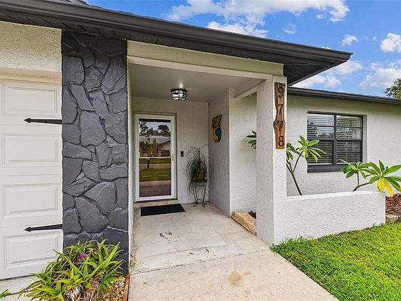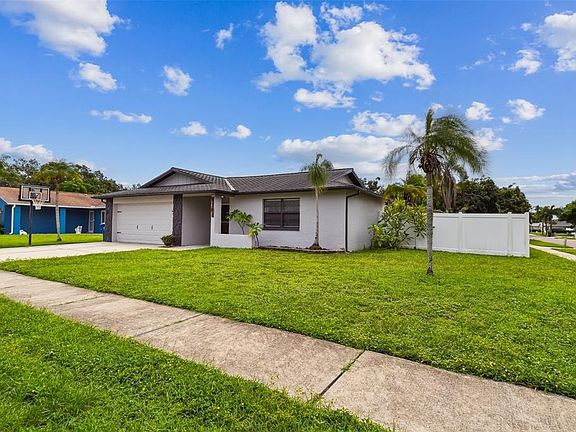 What you've been looking for! Location, Condition, Value- an excellent residence in the sought-after Blue Water Cove community. There were no flooding issues here with the 2024 storms and there are no HOA fees. This three bedroom, two bath corner lot home has been lovingly updated and has spacious outdoor spaces for relaxing and entertaining. Location is an easy drive to the sparkling sands of the Gulf beaches, Tampa, shopping and dining. Walk to the canal and drop in a hook and try your luck or pull your boat out from the backyard covered storage and head to Gulf. Your open kitchen, with breakfast bar has French door refrigerator, range, microwave and dishwasher. Washer and dryer are just steps away in the garage.